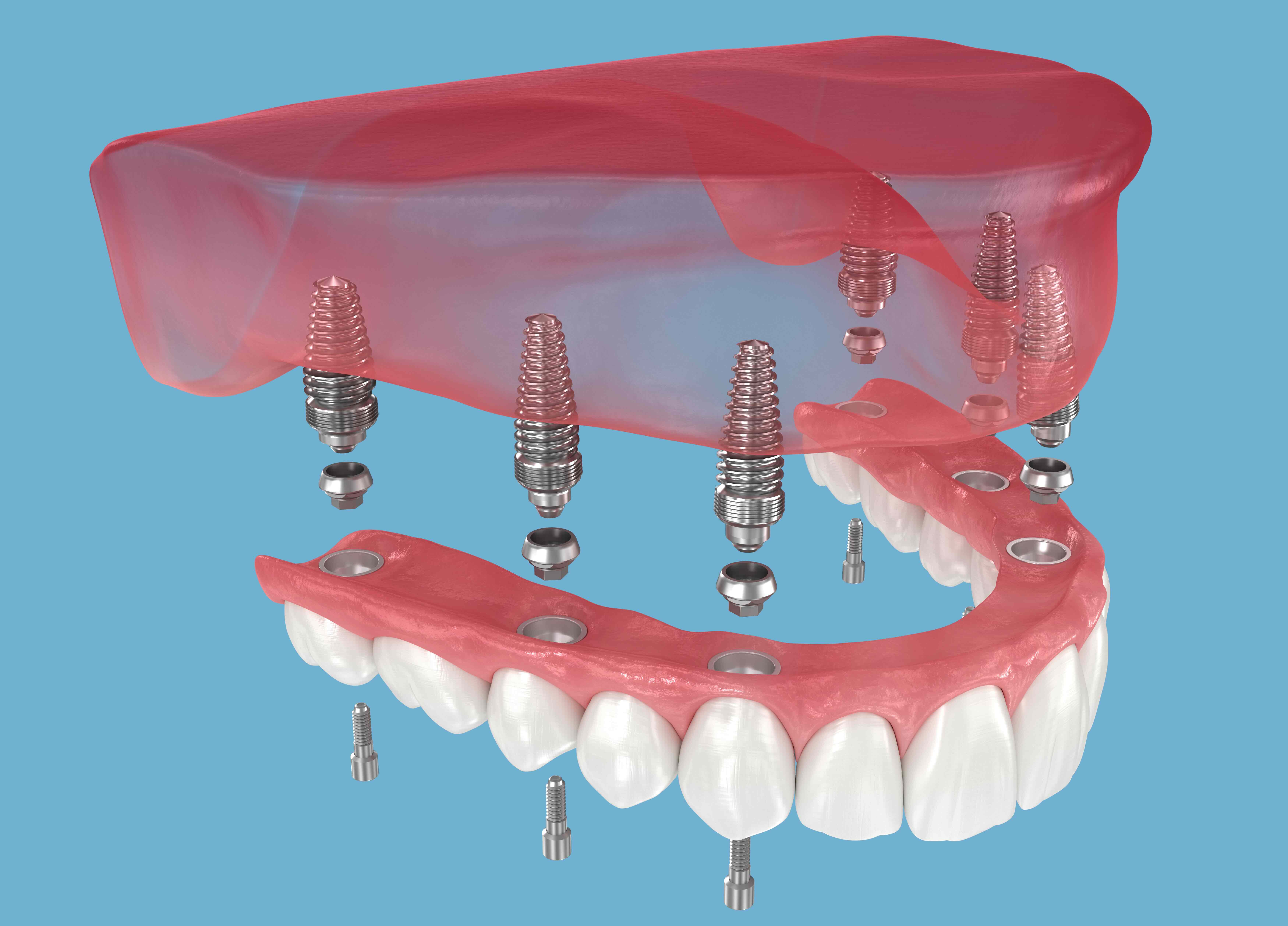 Dental implants are strategically placed in the jawbone to create a strong foundation for your new teeth. For full-arch restoration, typically 4–6 implants per arch provide stable support. In many cases, temporary teeth can be delivered the same day so you never leave without a smile.